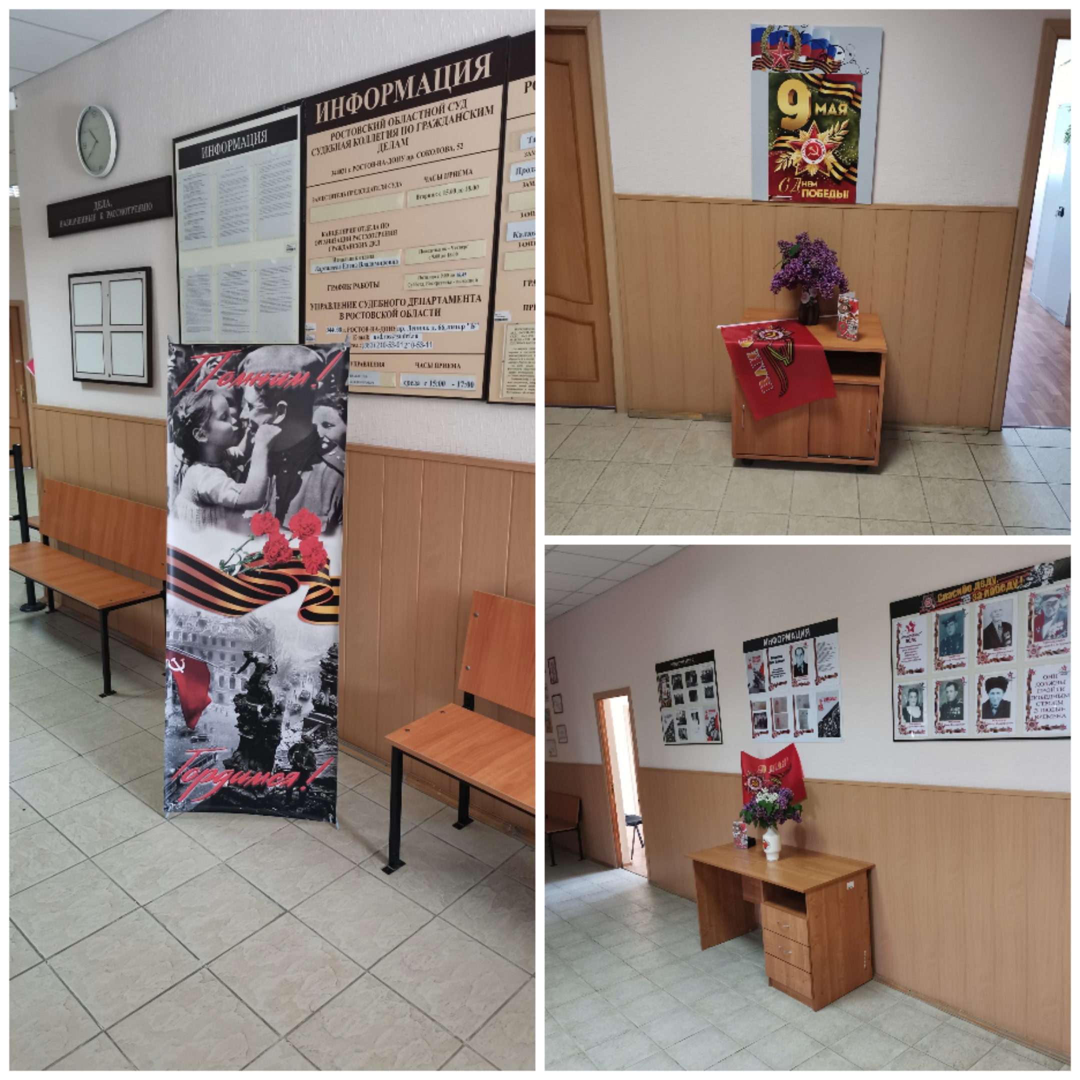 В преддверии празднования 9 мая холлы Обливского районного суда Ростовской области и Постоянного судебного присутствия в ст. Советской Ростовской области преобразились, наполнившись атмосферой торжественности и памяти.